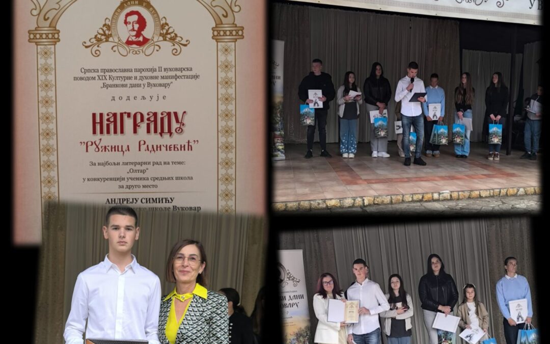 Na završnoj svečanosti Kulturne i duhovne manifestacije „Brankovi dani u Vukovaru“ 28. rujna 2025. godine dodijeljena je druga nagrada Andreju Simiću, učeniku 1.b razreda naše škole za literarni rad. Mentor učeniku bila je Mirjana Radišić Balihodžić, prof. srpskog jezika.