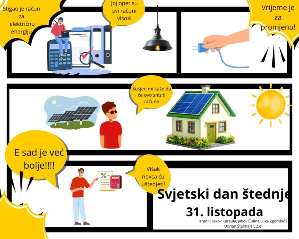 Povodom Svjetskog dana štednje, koji se obilježava 31. listopada, učenici 2.e razreda naše škole sudjelovali su u zanimljivoj i kreativnoj aktivnosti. Kroz izradu stripa, učenici su istražili i na slikovit način prikazali kako je štednja povezana s održivim razvojem i odgovornim odnosom prema novcu, prirodnim resursima i zajednici.